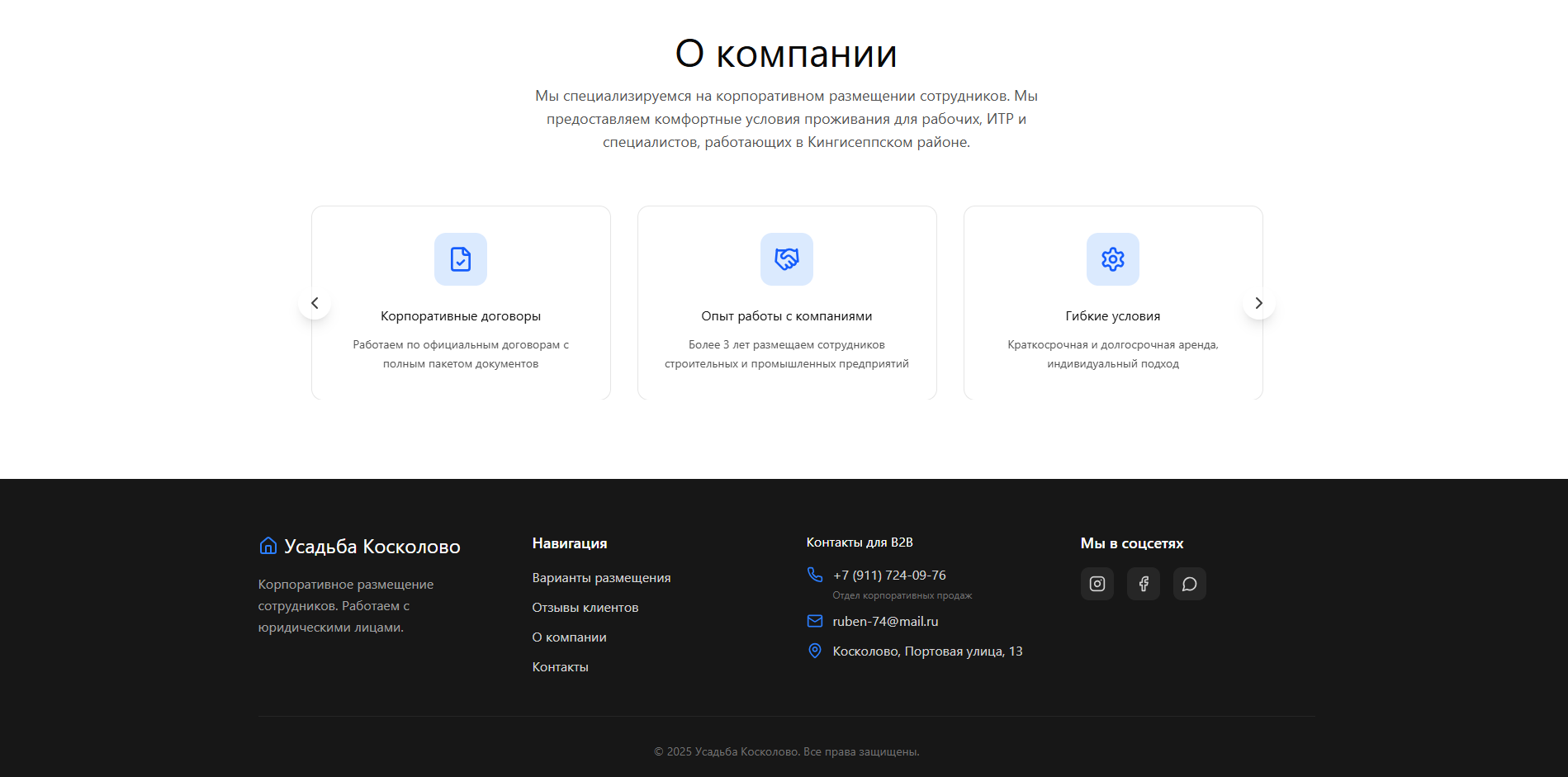 Разработана аккуратная структура с чёткой информацией о доступных домах, условиях проживания, удобствах и ценах, обеспечена адаптивная верстка для комфортного просмотра на мобильных устройствах и SEO‑оптимизация для привлечения поискового трафика.